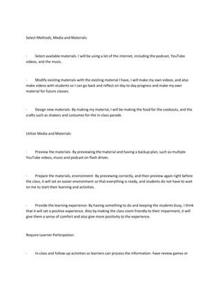 The teacher will be instructing a group of students aged 10-19 who recently immigrated from Russia on the topics of the Fourth of July. They will conduct interviews and give an entry test to determine students' existing knowledge and learning styles. Objectives are for students to learn the words to "The Star Spangled Banner", colors in fireworks, what a parade contains, and cookout activities. Lessons will incorporate kinesthetic and auditory learning styles using internet materials, videos, music, crafts, cooking, and a miniature parade. Formative and summative assessments will evaluate students' and teaching methods' effectiveness.