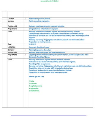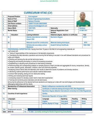 Samson Chombe is applying for the position of Civil Engineer at Rankin Engineering Consultants. He has over 14 years of experience in civil engineering and materials testing. He holds a Bachelor's Degree in civil engineering from Atlantic International University in Hawaii. His professional experience includes conducting various materials tests on soils, aggregates, asphalt, concrete and bitumen. He is proficient in establishing quality control programs and developing mix designs. He is currently working on the Chingola Solwezi Rehabilitation Road Project in Zambia.