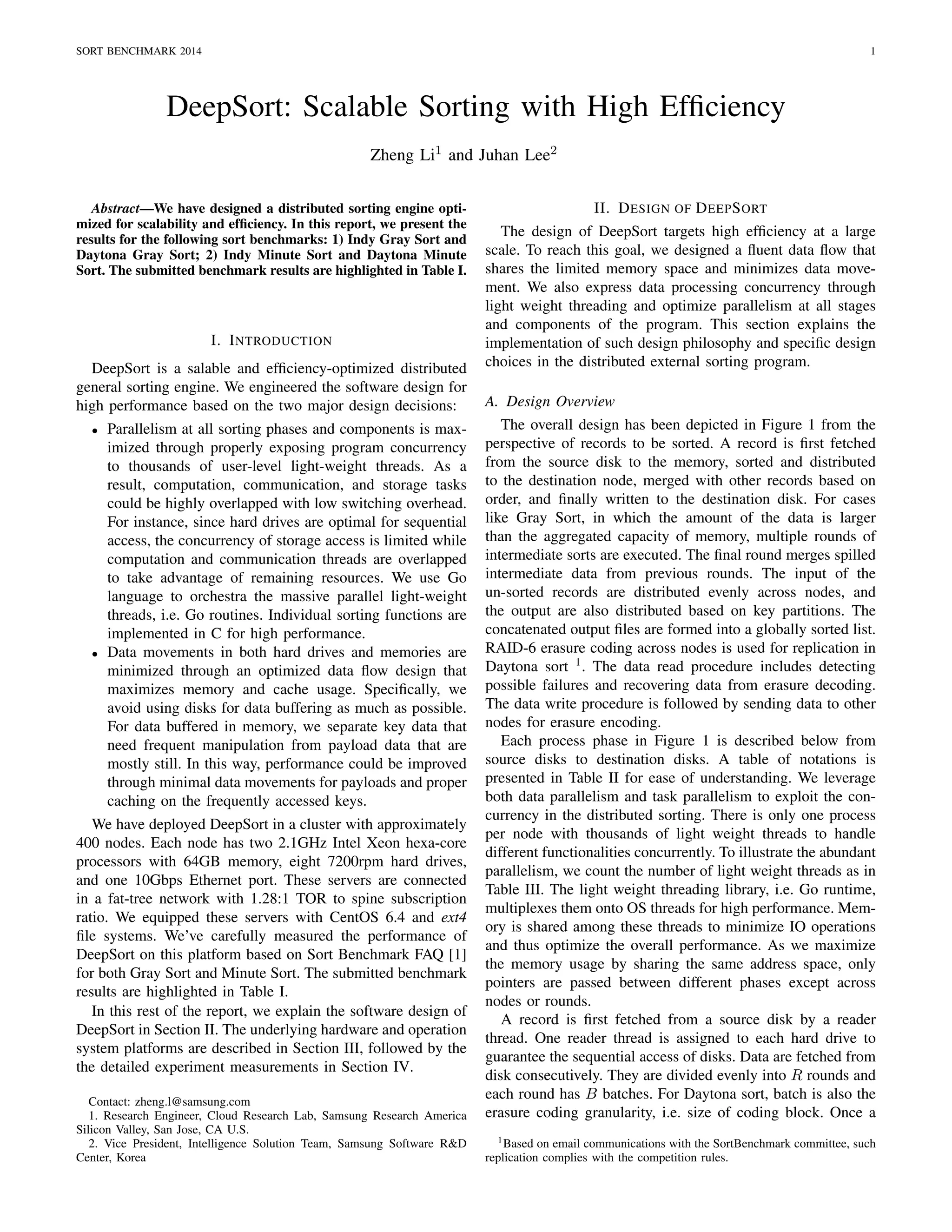 The document describes Deepsort, a scalable and efficient distributed sorting engine optimized for performance through parallelism and minimized data movement. Deepsort is implemented on a 400-node cluster and leverages lightweight threading and optimized data processing to enhance sorting capabilities across large datasets. Benchmark results demonstrate its effectiveness in handling gray sort and minute sort tasks with significant throughput improvements compared to existing sorting solutions.
