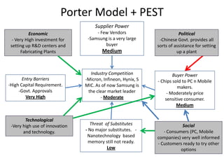 This document analyzes Samsung's electronics business using various frameworks like Porter's Five Forces and its value chain. It finds that Samsung has medium supplier power and buyer power but high barriers to entry due to large capital requirements. It has a competitive advantage from large investments in R&D and manufacturing facilities. However, it faces challenges from growing competition in China which provides government support to domestic companies.