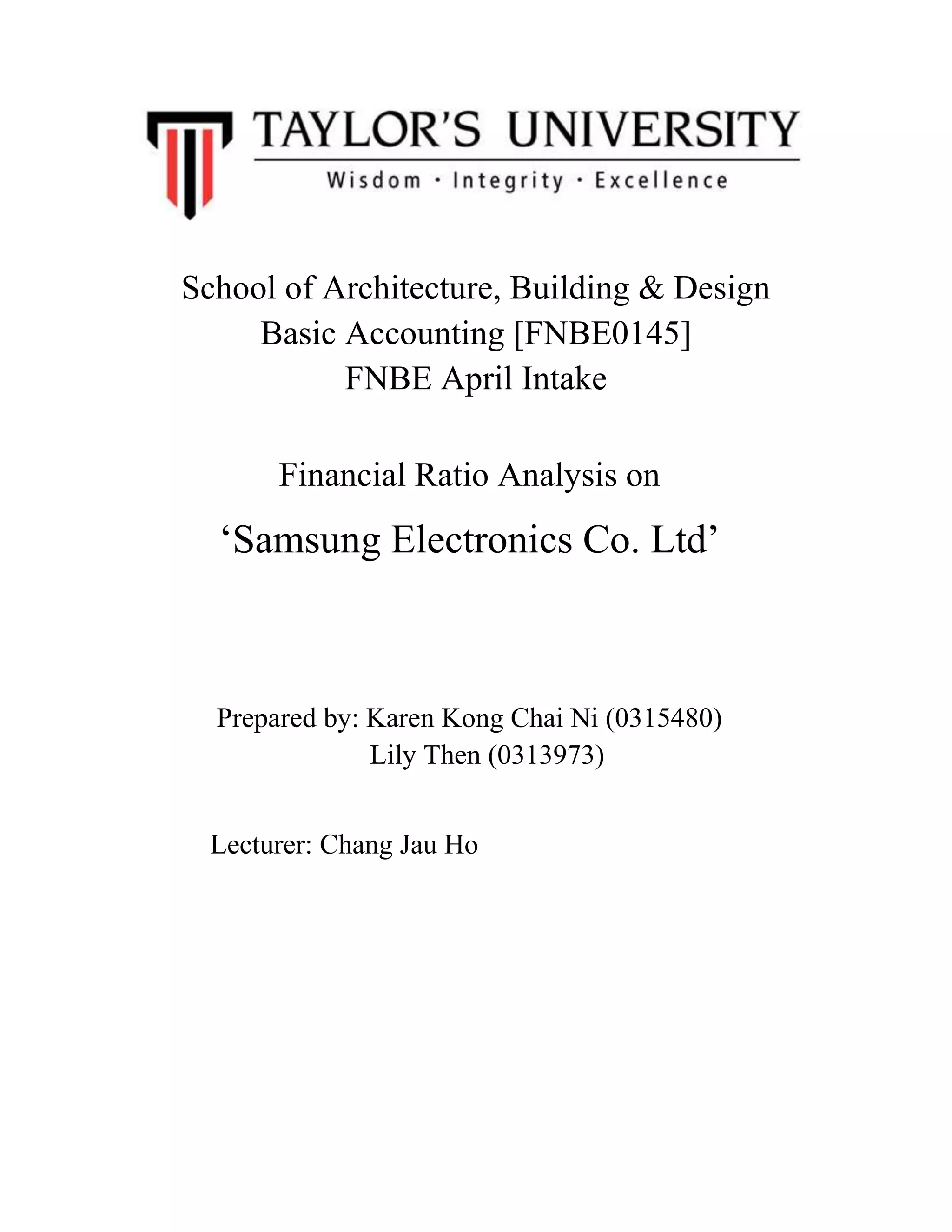 Samsung Electronics Co. Ltd is South Korea's largest electronics producer. It has four main divisions: Digital Media, Semiconductors, Information & Communications, and Home Appliances. The document provides a 3-year financial ratio analysis of Samsung from 2011-2012. It found that Samsung's profitability, stability, and ability to pay debts improved over this period. Specifically, its return on equity, net profit margin, and gross profit margin increased. Debt levels and expenses as a percentage of sales decreased. The analysis recommends investing in Samsung as it is profitable, stable, and its shares offer a reasonable price-earnings ratio of 6.65 years.