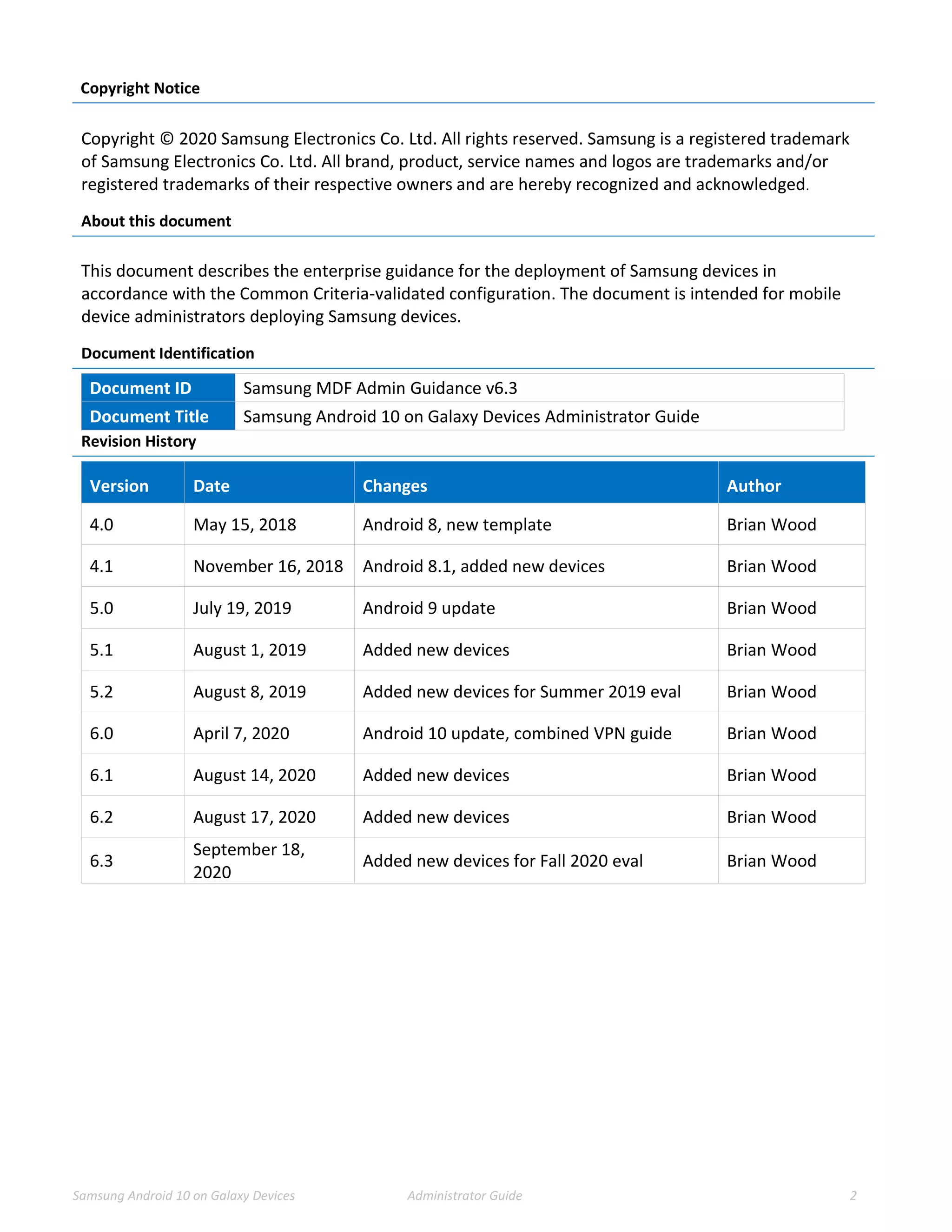 This document provides guidance for administrators on deploying and configuring Samsung devices to meet the requirements of the Common Criteria evaluation. It covers the evaluated devices and their equivalents, how to enable the Common Criteria mode, recommended security settings and VPN configurations. It also discusses device delivery, updates, and operational security practices like data wiping.