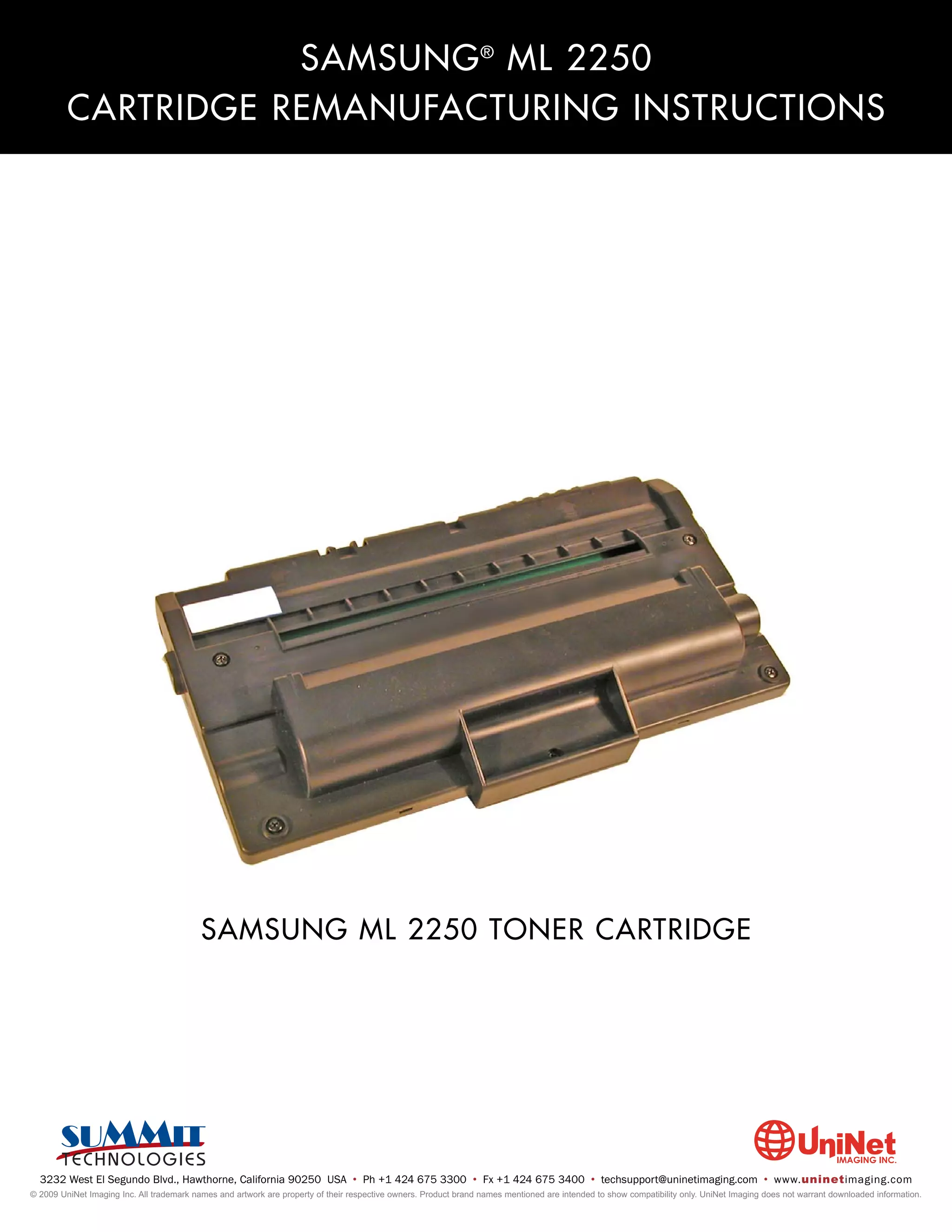This document provides instructions for remanufacturing the Samsung ML-2250 toner cartridge. It describes removing and replacing various cartridge components like the toner hopper, gears, and chip. Common cartridge problems like a dirty primary charge roller or scratched drum could cause issues like streaks or ghosting in prints. The document also lists error codes indicated by the printer's LED lights.