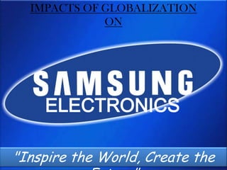 Globalization has allowed Samsung to become a global electronics brand. Founded in 1938 in Korea, Samsung began manufacturing electronics like TVs and radios. In the 1980s it expanded into telecommunications, and in the 1990s it partnered with Sprint to launch its mobile phones in the US market. This helped Samsung become a threat to Apple. As Samsung expanded globally with assembly plants in 61 countries, it gained advantages of low costs. It has won many design awards and now employs over 319,000 people worldwide. Globalization helped spread Samsung's technology and allowed it to launch popular product lines like the Galaxy smartphones that compete with Apple's iPhones.