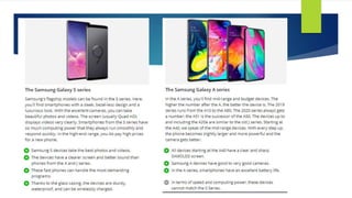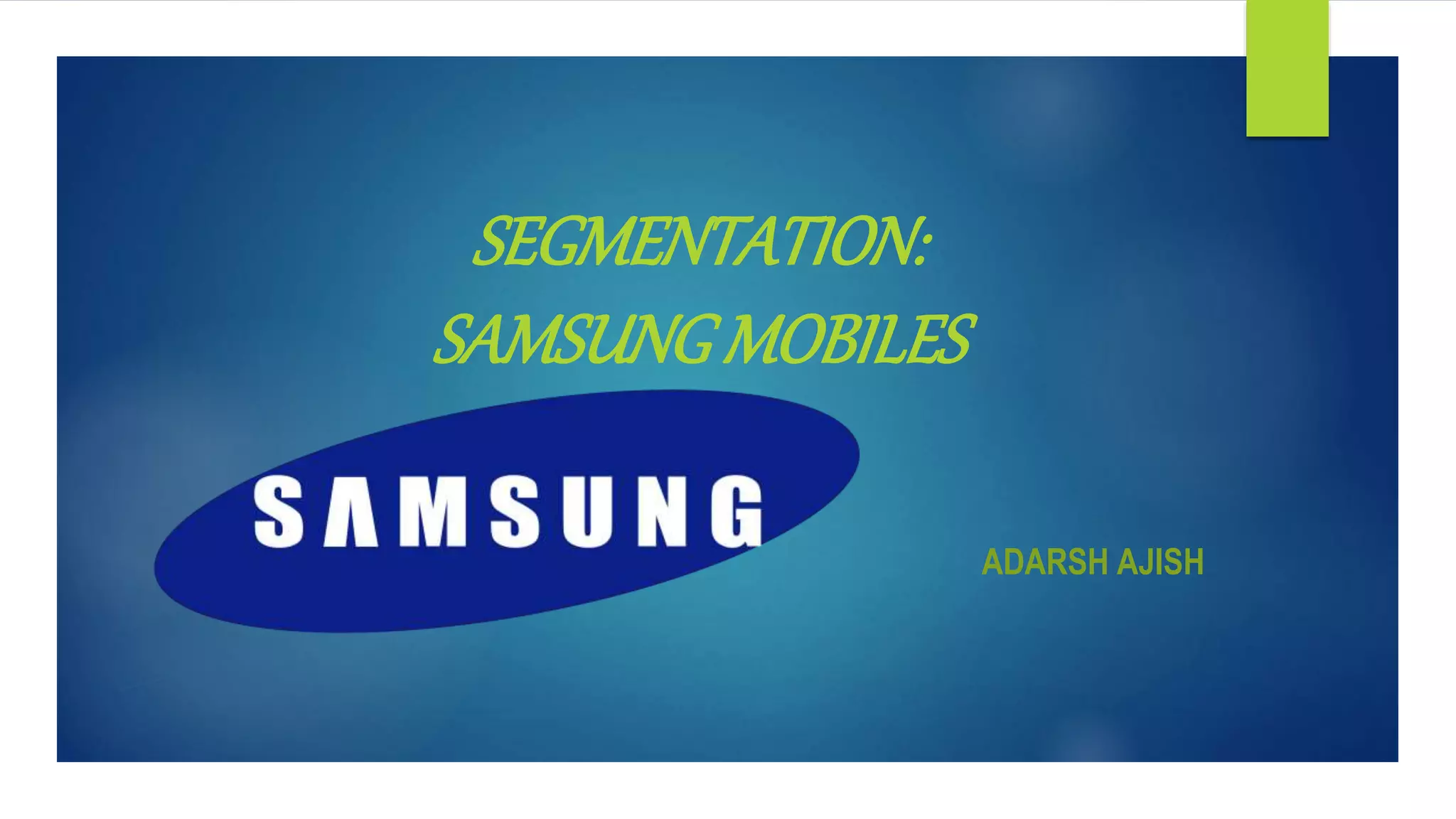 Samsung was established in 1938 as a trade company in Korea and diversified into electronics in 1969. In the 1990s, Samsung's chairman transformed it into a leading electronics manufacturer by focusing on high-quality, innovative products. Samsung segments its mobile phone market geographically, demographically, and psychographically. It targets a broad range of customers from different ages, incomes, and lifestyles. Samsung positions itself as producing high-quality, innovative smartphones and creating a unique brand image through creative marketing strategies.
