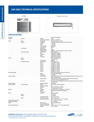 The Samsung SHR-5082 is an 8-channel digital video recorder that can record video from cameras at up to 120 images per second and distribute the recording across its 8 channels. It uses MPEG-4 compression to provide high quality images while efficiently using storage space. The DVR has multiple storage and backup options including internal hard drives up to 750GB each and a built-in DVD-RW drive.