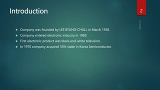 Samsung was founded in 1938 and entered the electronics industry in 1969 with its first black-and-white television. It has since become one of the largest manufacturers of televisions, smartphones, and semiconductors in the world. Samsung's vision focuses on inspiring the world through innovative technologies and design that improve lives and contribute to social prosperity. Its mission is to use human and technological resources to create superior products and services that benefit global society. The document provides an overview of Samsung's business in LED technologies, mobile phones, tablets, TVs, and other products, as well as its operating and marketing strategies.