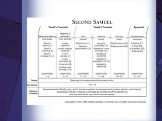 The document provides background information on the biblical book of 1 Samuel, which covers the period from 1080-1040 BC and the transition of Israel from a loose confederation of tribes governed by judges to a monarchy with its first king, Saul. It describes key events like Hannah's prayer for a son and the birth of Samuel, Eli's wicked sons and the loss of the Ark, and Samuel calling the people back to God. Samuel's own sons misuse their power as judges, leading the people to demand a king. Samuel reluctantly agrees and anoints Saul as the first king of Israel.