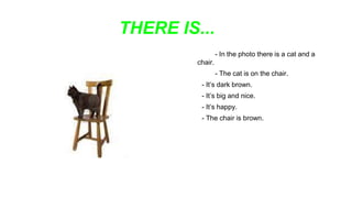 The document describes various photos containing different objects and scenery such as a cat on a chair, a dog playing with a ball, an open door showing a sunny landscape, trees without leaves at night, and a TV screen displaying a mountain landscape with snow. It uses phrases like "There is/are/isn't/aren't" to describe what is and isn't present in each photo, and "Is there/Are there" to ask and confirm details about the photos.