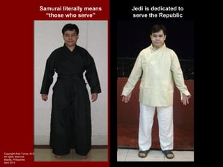 Samurai and Jedi share similarities as warriors who serve masters or leaders, following orders without hesitation. They both use practice swords in training - samurai use wooden swords while Jedi use training lightsabers. Both cultures have codes of honor that guide warriors' behavior. However, they also have differences in how they are trained from a young age and in their roles - samurai are dedicated to protecting Japan while Jedi serve as peacekeepers across the galaxy.