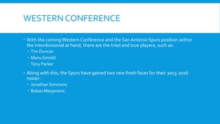 The San Antonio Spurs roster for the 2016 season includes returning veterans Tim Duncan, Manu Ginobli, and Tony Parker. They have also added two new players: Jonathan Simmons, a guard born in 1989 who played for the Spurs' summer league team; and Boban Marjanovic, a 7'3" Serbian center born in 1988 who won European championships and had a promising debut for the Spurs. With these returning stars and new additions, the Spurs hope to build on their 2015 championship and pursue a sixth title.