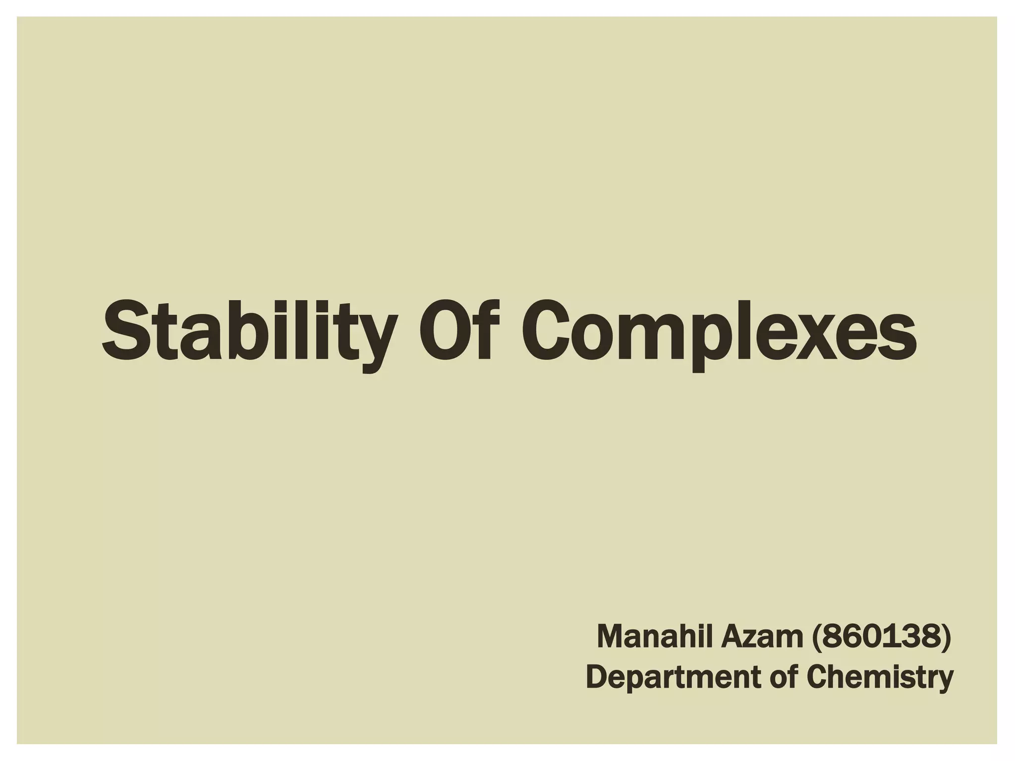 This document discusses the stability of metal complexes. There are two types of stability: thermodynamic stability and kinetic stability. Thermodynamic stability is determined by equilibrium constants and Gibbs free energy, while kinetic stability refers to the reactivity of ligand substitution reactions and is determined by reaction rates and activation energies. The factors that influence the stability include the nature of the metal and ligand, such as their size, charge, and electronegativity. The stability tends to increase with higher charges, smaller sizes, and more basic ligands. Chelates are generally more stable than open structures.