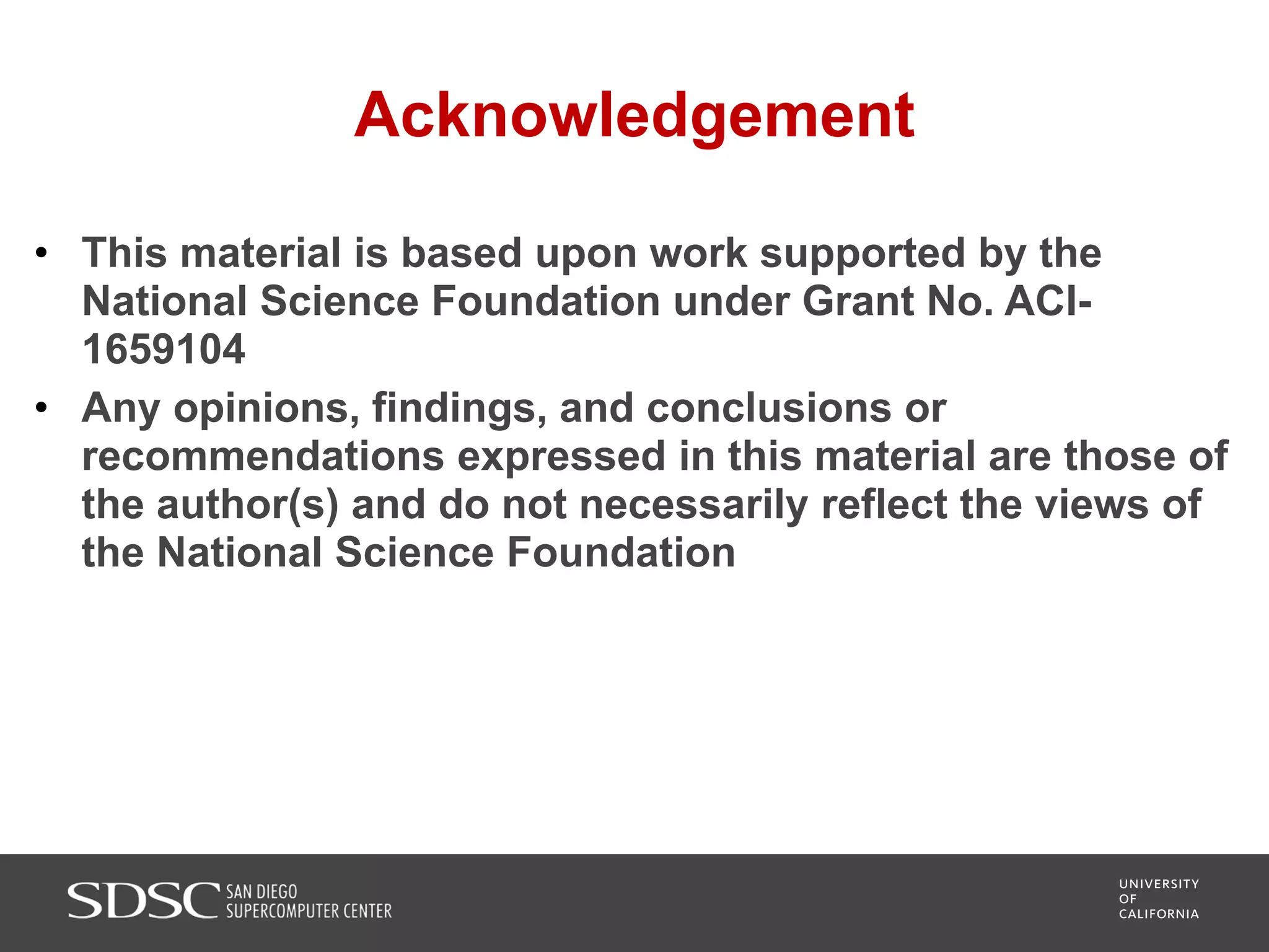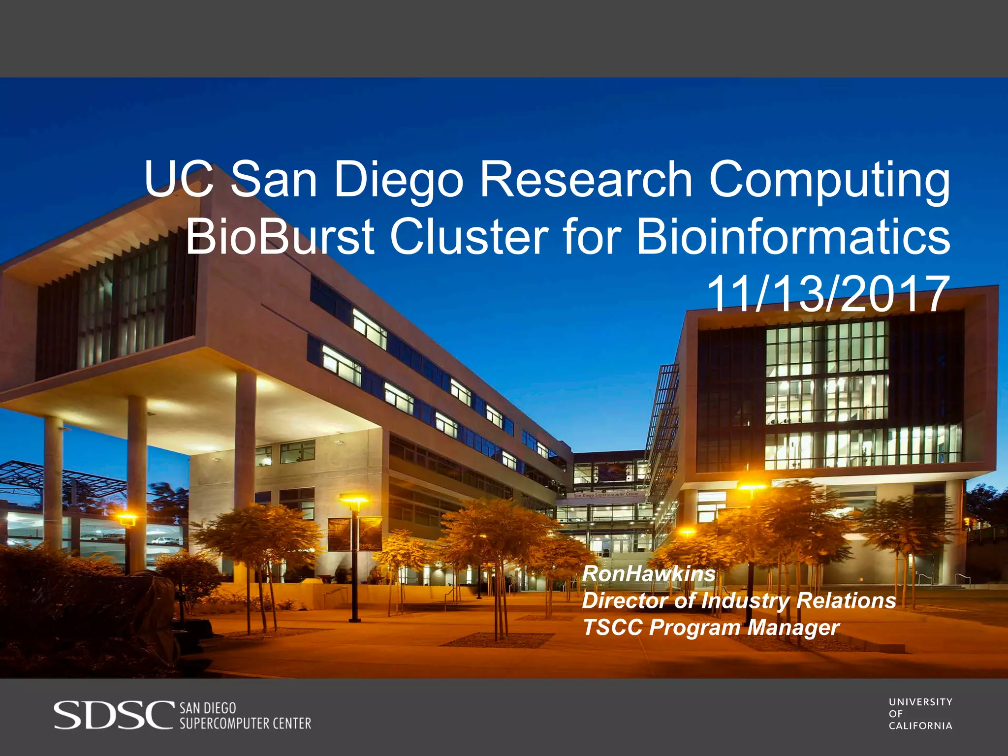 UC San Diego's BioBurst cluster provides additional resources for bioinformatics workloads through an I/O accelerator, FPGA-based computational accelerator, and 672 additional compute cores. The I/O accelerator uses 40TB of flash memory to alleviate small block/file I/O issues in bioinformatics applications. The FPGA accelerator can perform genome analysis tasks much faster than standard hardware. The resources are integrated with UC San Diego's existing high performance computing cluster to improve research productivity and address bottlenecks in genomics and other bioinformatics applications and pipelines.
