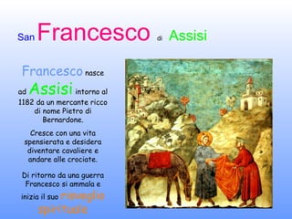 Francesco d'Assisi, nato intorno al 1182, lascia la vita agiata di mercante per dedicarsi alla spiritualità e vivere tra i poveri, attirando disprezzo e ammirazione. Fondatore dell'Ordine dei Frati Minori, compie miracoli e promuove la pace, instaurando una profonda amicizia con Chiara, che segue il suo esempio. Alla sua morte, avvenuta dopo aver ricevuto le stimmate, viene subito proclamato santo e la sua vita continua a ispirare molti.