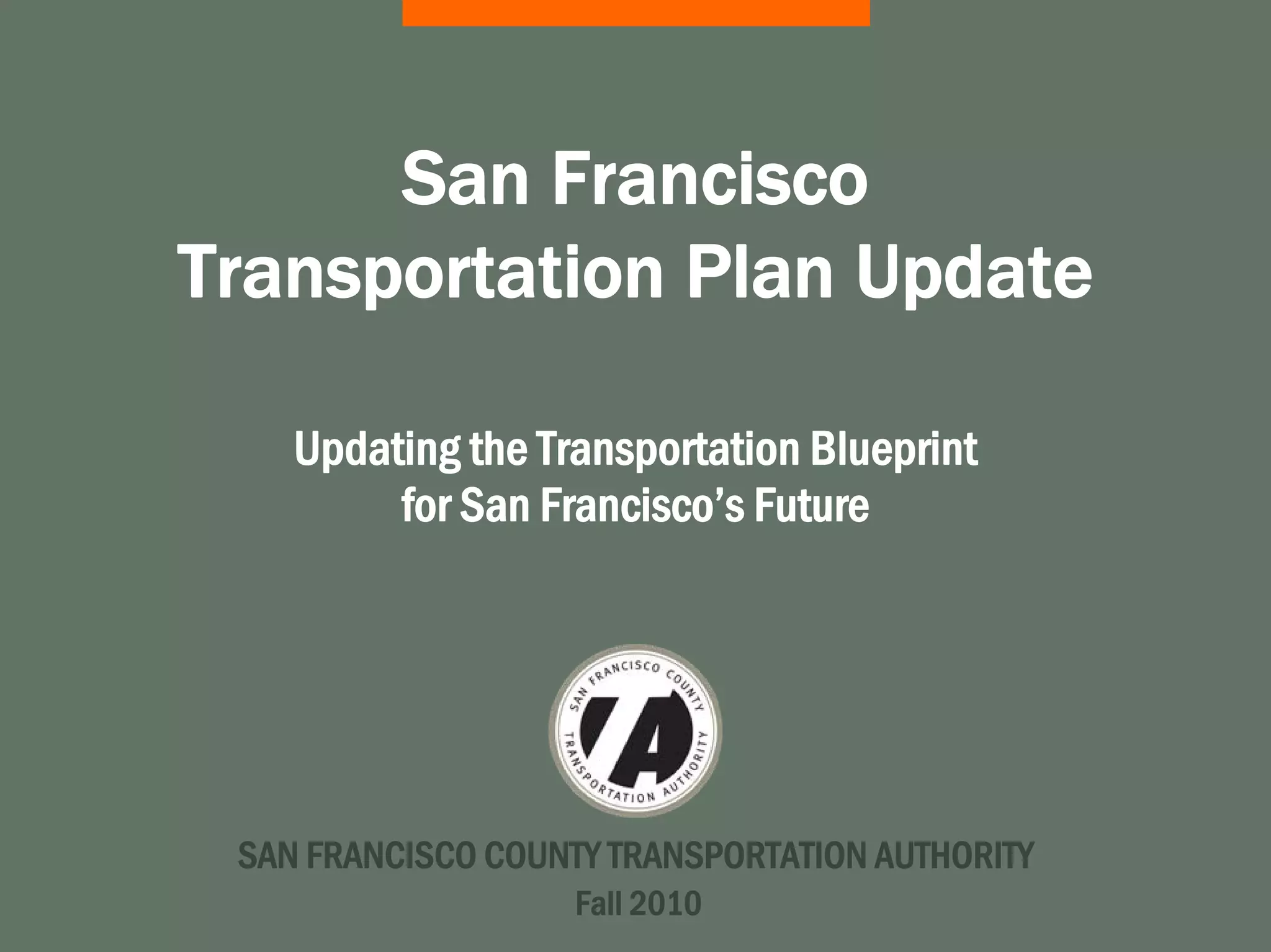 The San Francisco County Transportation Authority is updating the city's 25-year transportation plan to address changing conditions and priorities. The plan will establish goals for all modes of transportation through 2035. It will identify transportation needs and recommend projects to improve mobility, environmental quality, and economic competitiveness while creating a more livable city. Public input is being gathered to develop the draft and final plans over the next two years.