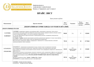 Документ содержит прайс-лист на декоративные краски и покрытия от завода San Marco, включая описания материалов, их характеристики, способы нанесения и цены на упаковки. Приведены детали о различных продуктах, таких как Cavenier, Lanuova, Cadoro и Marcopolo, которые предлагают широкий выбор текстур и цветовых решений для оформления интерьеров. Вся информация представлена с указанием цен в рублях и рекомендациями по использованию.