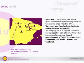 Axial Vinos is a creative Spanish wine company specializing in the production and export of wines from renowned Spanish denominations of origin, including Cariñena, La Rioja, and Somontano. The San Nicolás de Tolentino winery, founded in 1945, focuses on red wines made primarily from Garnacha, Tempranillo, and Cariñena grapes, reflecting the rich viticultural heritage of Aragón. Their wine portfolio includes various offerings such as the Abrazo blanco, rosado, and tinto, which cater to diverse palates and pair well with different cuisines.