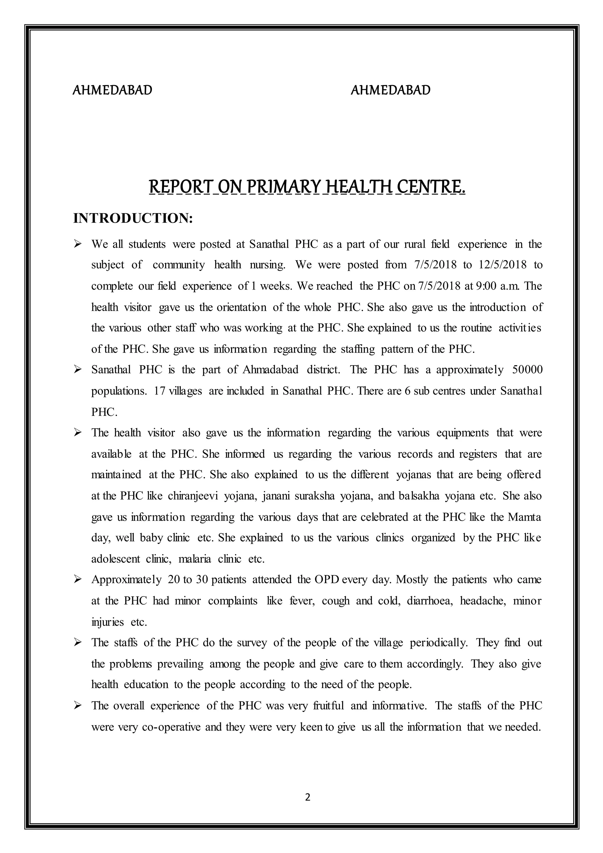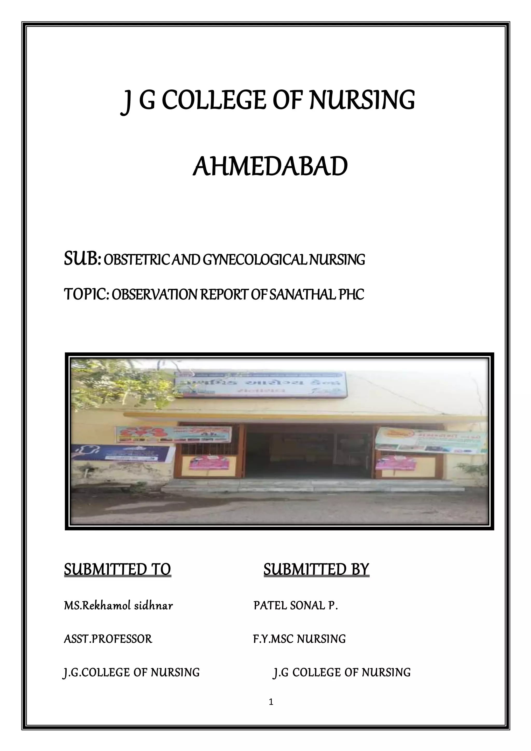 1. The document describes a nursing student's 1-week observation and report at the Sanathal Primary Health Centre (PHC) in Ahmedabad, India.