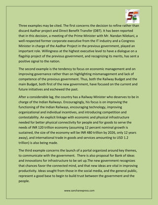 The document discusses key economic management characteristics of Prime Minister Narendra Modi's government, highlighting the initial positive steps taken to restore trust and improve governance following years of perceived mismanagement by the previous government. It outlines examples such as refining the Aadhar project, focusing on current economic initiatives, and enhancing public communication to build trust. The government's priorities include raising growth rates, fiscal consolidation, and generating livelihoods, while being aware of existing constraints and the need for gradual yet impactful reform.