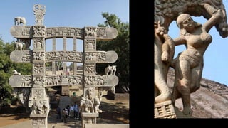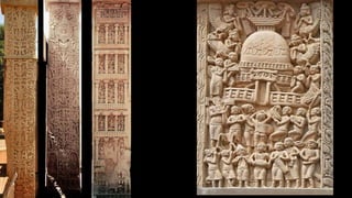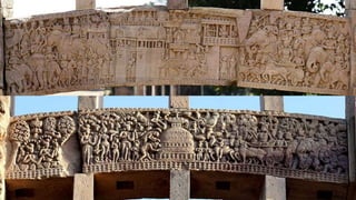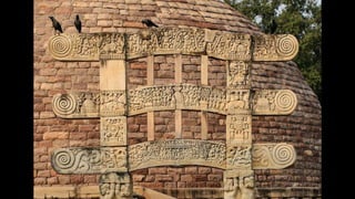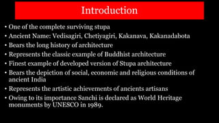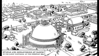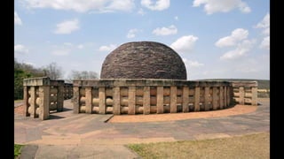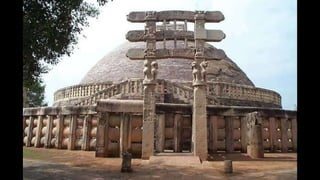 The Sanchi Stupa, a UNESCO World Heritage site since 1989, is a prominent example of Buddhist architecture in India, with a rich history dating back to the Mauryan, Shunga, and Satavahana periods. It showcases various architectural developments over time, including the addition of gateways and decorative elements, reflecting the social and religious conditions of ancient India. The structure evolved significantly, particularly the Great Stupa, which expanded in size and complexity, representing the artistic achievements of ancient artisans.