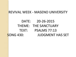 The document provides details about a revival week scheduled at Maseno University from 20-26 July 2015. The theme is "The Sanctuary" based on Psalm 77:13. It discusses the importance of focusing revival messages on key truths like the sanctuary and God's commandments, rather than less important topics. It encourages believers to partake of the latter rain refreshing by appropriating God's grace. When God's people preach his message with power, the earth will be filled with his glory as foretold in scripture for the final harvest before Christ's return.