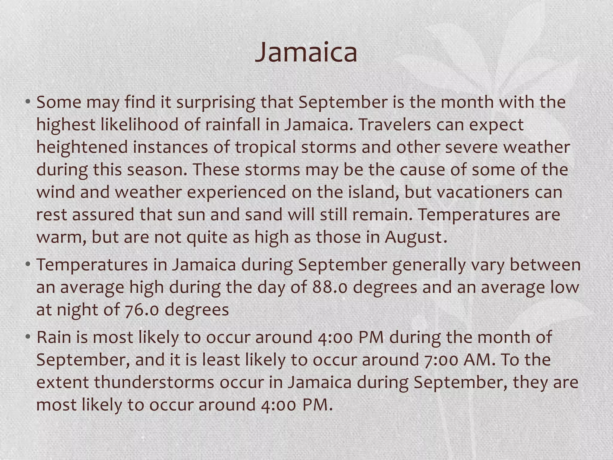 September is the rainiest month in Jamaica, with frequent tropical storms. Temperatures average 88 degrees F during the day and 76 degrees at night. Rain is most likely around 4pm and least likely around 7am. Sandals Grande Riviera Beach & Villa Golf Resort is an all-inclusive, adults-only resort located in Ocho Rios, Jamaica offering luxury amenities like golf, dining, and a spa. Guests can book a butler suite for personalized concierge services including meal delivery and arranging activities.
