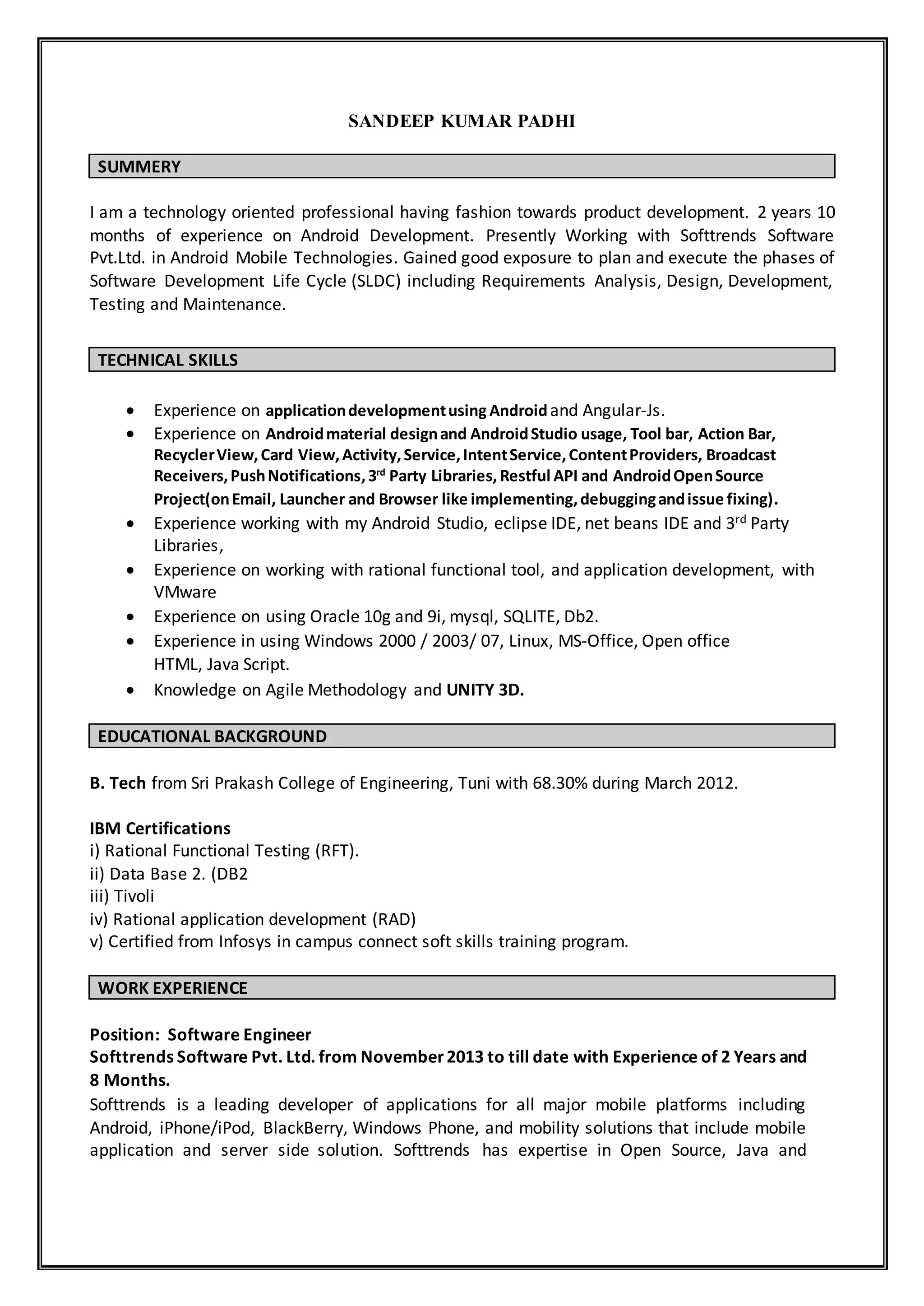 Sandeep Kumar Padhi has over 2 years of experience in Android development. He has expertise in developing mobile applications using technologies like Android, AngularJS, and SQLite. Some of the mobile applications he has worked on include medical applications for clinics, pharmacies and patients, as well as applications for e-commerce, transportation and CRM. He is proficient in Java, Android Studio and various IDEs.