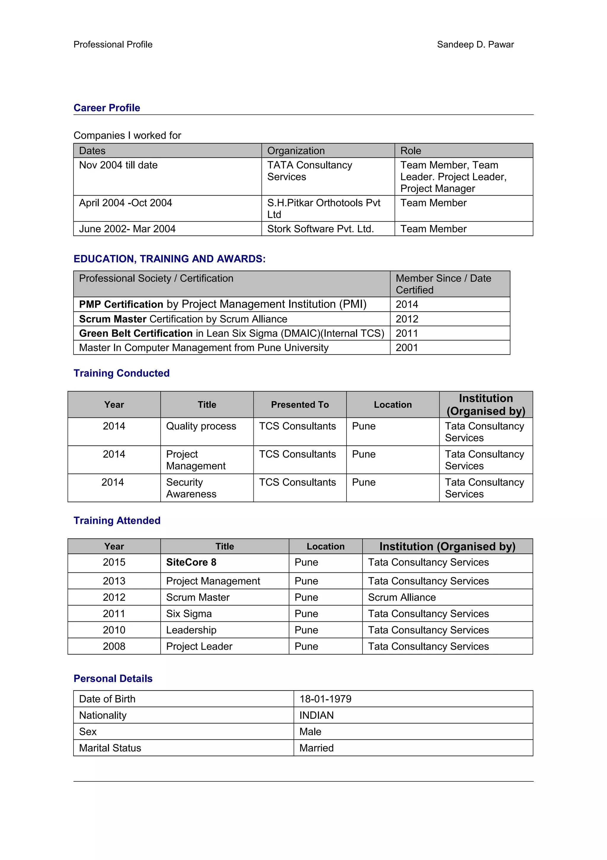 This professional profile summarizes Sandeep Pawar's experience as a Project Manager with over 12 years of experience in software development and project management. He has managed teams of 5-17 resources on varied technology projects, and has skills in Agile, Waterfall, and Six Sigma methodologies. He is a certified PMP, Scrum Master, and Six Sigma Green Belt with a track record of delivering projects on time and within budget.
