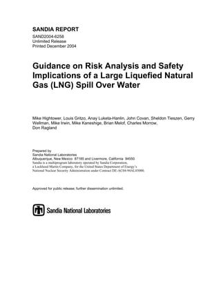 This document summarizes a Sandia National Laboratories report on providing guidance for analyzing the safety and risk implications of a large liquefied natural gas (LNG) spill over water. The report reviews four recent LNG spill modeling studies and identifies gaps and limitations. It provides guidance on using appropriate models and analyses to evaluate accidental and intentional breach scenarios. The report concludes that while risks from accidental breaches may be relatively low, intentional breaches pose higher risks and require additional preventive measures and analyses to ensure public safety.