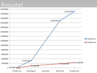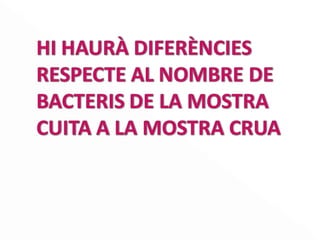 RESULTAT Hipòtesi verdaderaMolta diferència de bacteris entre la mostra de pollastre cru i cuit Una bona cocció elimina gran part de microorganismes. Cocció: relació entre la higienització dels aliments i la desnaturalització de les proteïnes que afavoreix a la digestió.