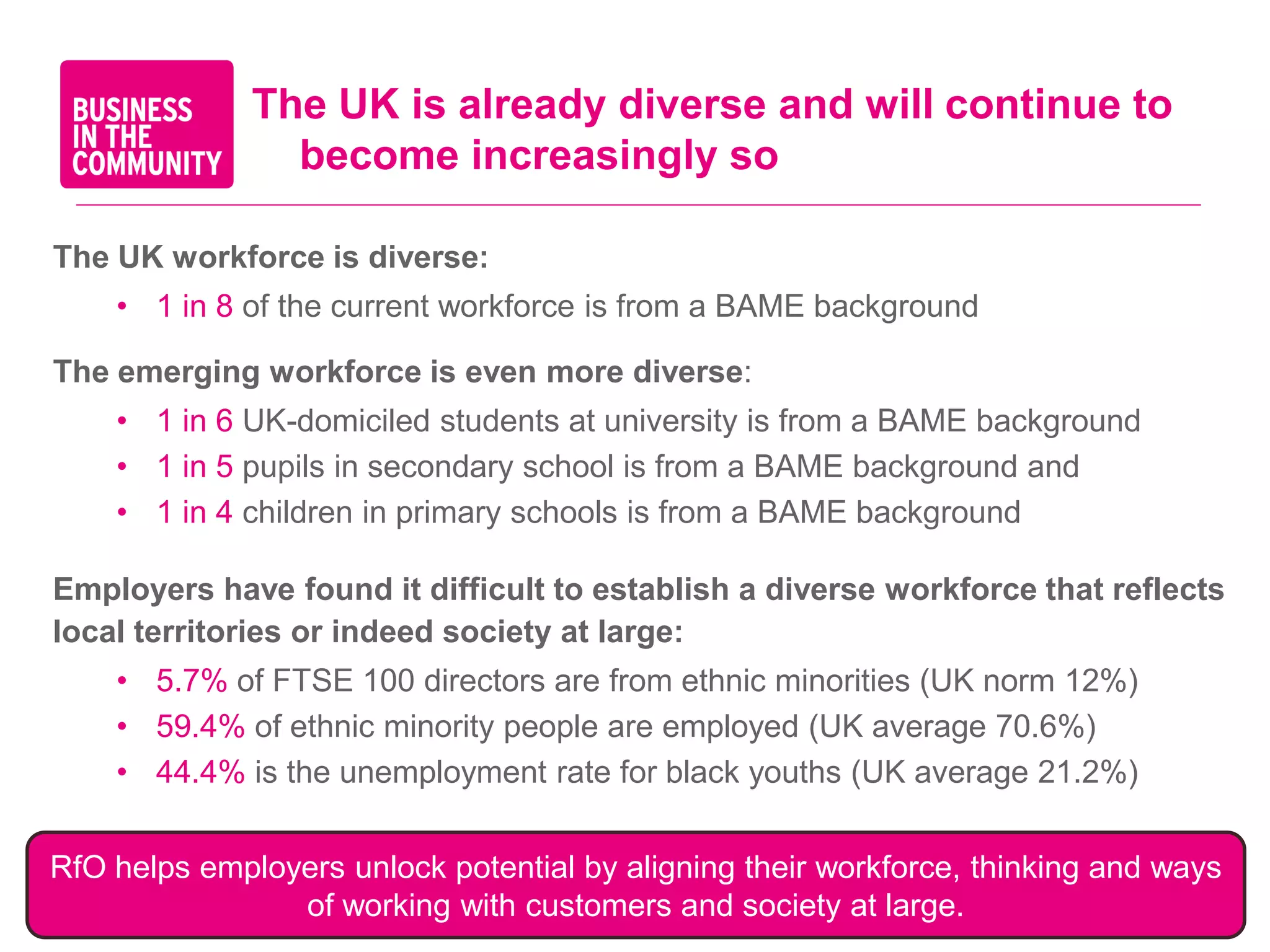 The document discusses diversity and inclusion in the UK workforce and media industry. It notes that the UK workforce is becoming increasingly diverse, yet ethnic minorities remain underrepresented in senior leadership and management roles. Specifically in the media industry, the document finds that over half of top journalists attended private schools, and ethnic minorities still see barriers to entering the industry. It provides recommendations for employers to promote greater access and inclusion through mentoring, recruitment practices, and addressing unconscious biases.