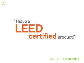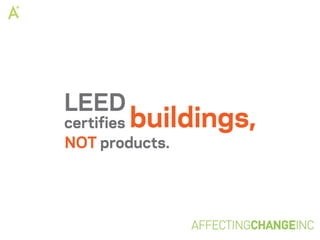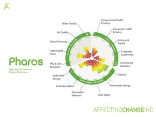 The document discusses various product evaluation and sustainability standards used by a library, emphasizing life cycle assessment and the importance of third-party certifications. It outlines preferences for materials and methods that promote sustainability, including reducing harmful substances and enhancing resource conservation. Additionally, it highlights initiatives beyond LEED standards aimed at improving environmental impact and community resilience.