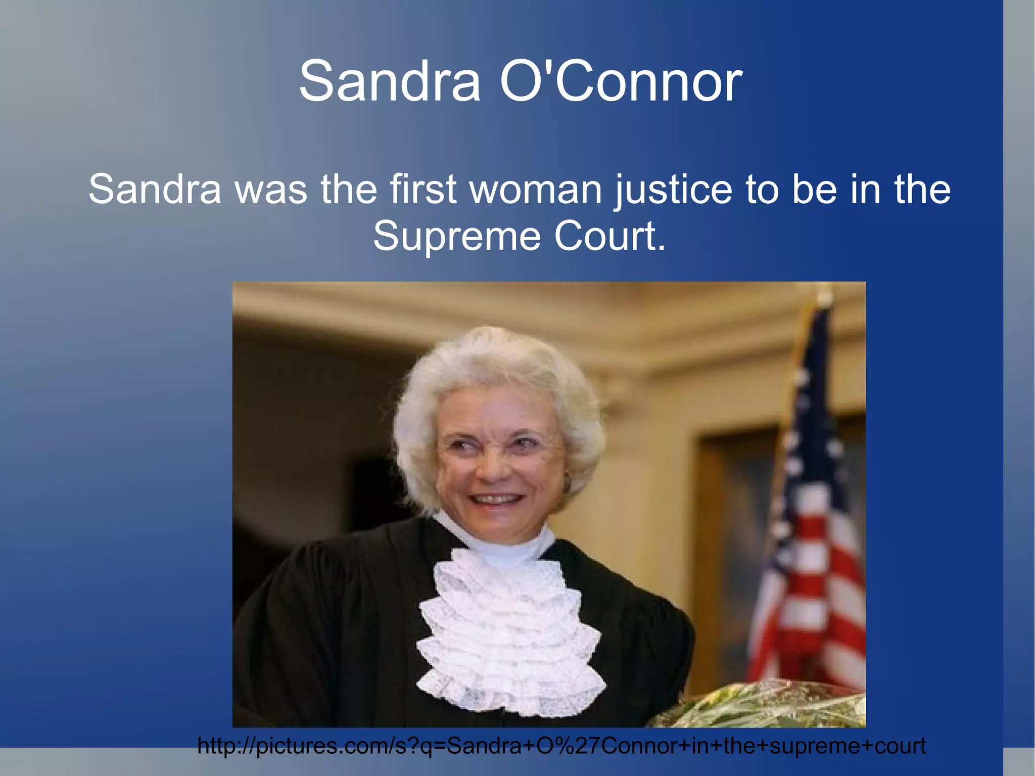 Sandra Day O'Connor was the first woman to serve on the Supreme Court. She was born in 1930 in Arizona and enjoyed collecting kittens as a child. O'Connor graduated law school with the third highest grades out of 102 students but faced challenges finding a job due to being a woman. She went on to give speeches in the state senate and is admired for her fairness in all decisions.