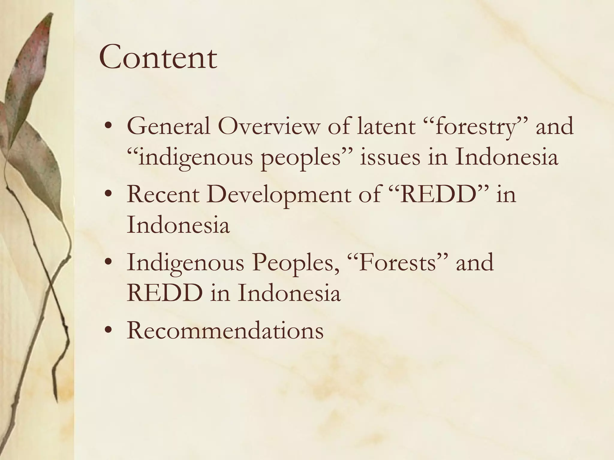 This document summarizes key issues related to land claims, forests, and indigenous peoples in Indonesia, and discusses the development of REDD+ programs in the country. It notes ongoing problems with definitions and contested land claims. Many proposed REDD+ projects are described. The document recommends that REDD+ processes ensure inclusion of indigenous peoples and address ongoing land conflicts through legal reforms and dispute resolution mechanisms. Substantive recommendations include integrating forest carbon management into natural resource plans at multiple levels.