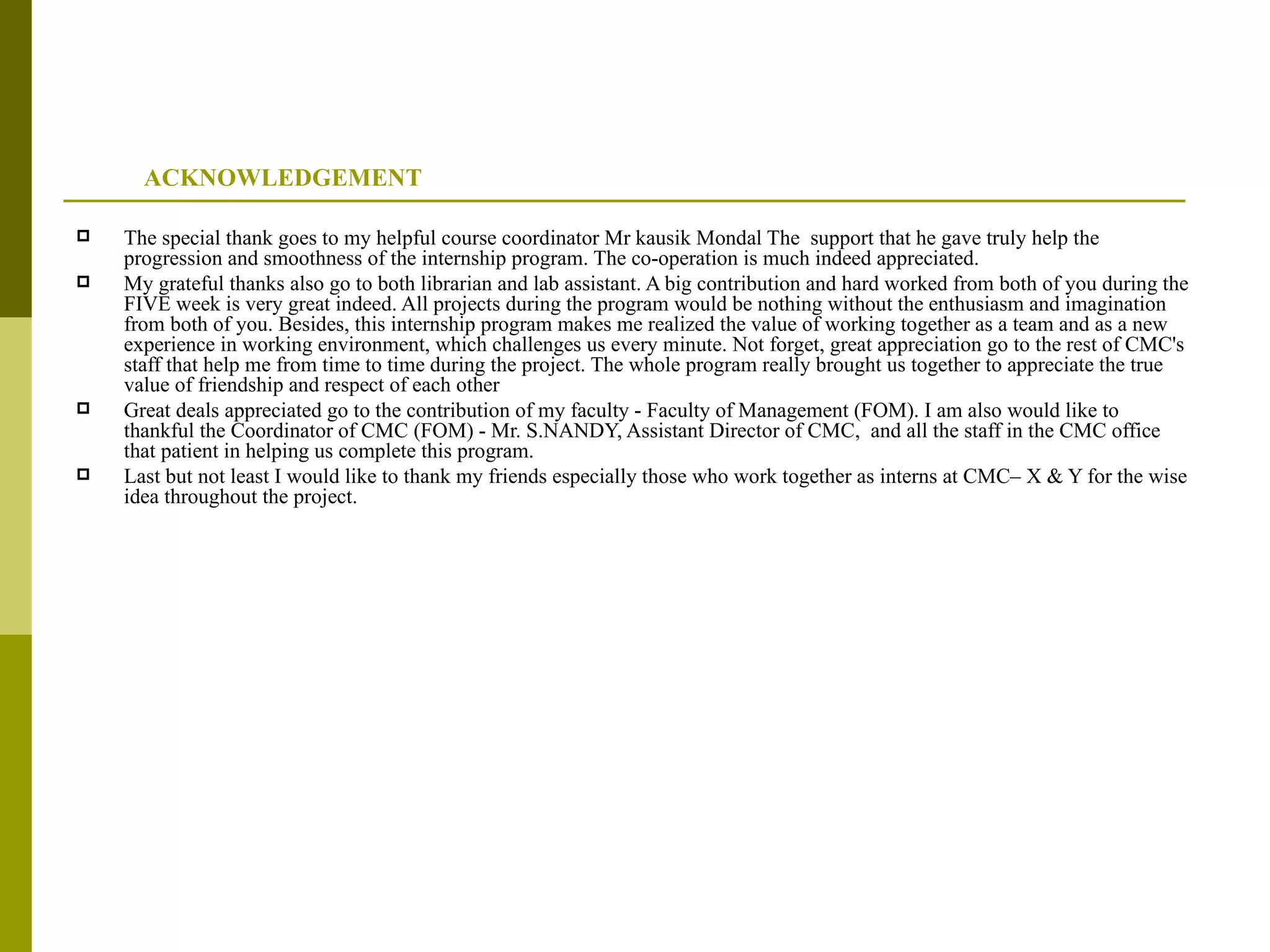 The document acknowledges and thanks several people for their contributions to an internship program. It thanks the course coordinator for their support, the librarian and lab assistant for their hard work, and other staff members for their assistance. It also thanks faculty, the program coordinator, and friends who worked as interns for their help and ideas throughout the project.
