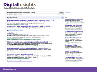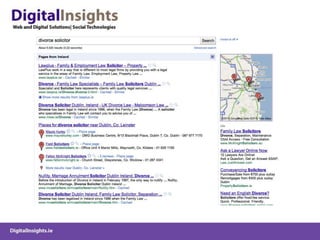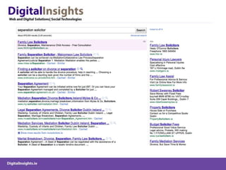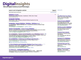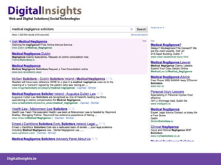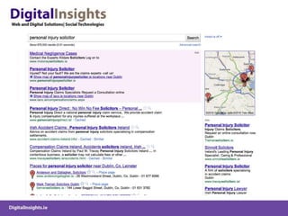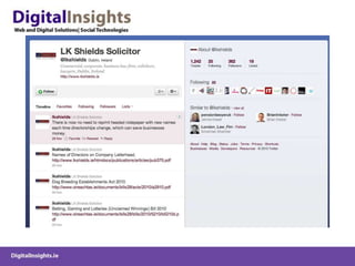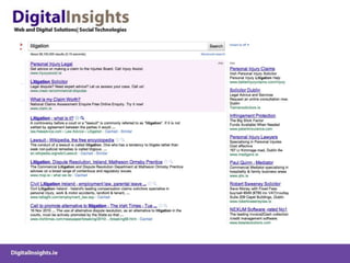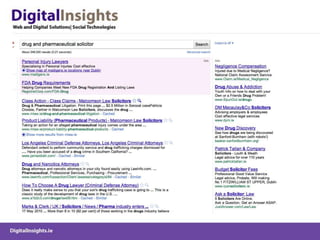 The document discusses various online marketing tactics for law firms, including content marketing, search engine optimization (SEO), social media platforms like LinkedIn, Twitter, and blogging. It provides examples of how some law firms have used organic and paid search strategies effectively. Key recommendations include developing valuable content, building links, monitoring social conversations, and measuring analytics to track online efforts.