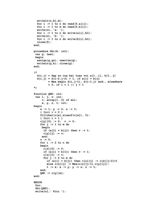 Tài liệu trình bày về bài toán tìm dãy con chung không liền kề dài nhất giữa hai dãy số nguyên dương bằng cách sử dụng thuật toán quy hoạch động với độ phức tạp O(n.m). Ngoài ra, tài liệu cũng hướng dẫn cách xác định số lượng đỉnh ổn định trong một đồ thị có hướng đối với một đỉnh cho trước, cùng với các ví dụ cụ thể về đầu vào và đầu ra. Hai chương trình mẫu bằng Pascal và C++ được cung cấp để minh họa các giải pháp cho hai bài toán trên.