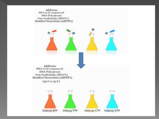 DNA sequencing is the process of determining the order of nucleotides in a DNA molecule. The Sanger method, developed in 1977, was the most widely used sequencing technique for 25 years. It utilizes chain termination with dideoxynucleotides which lack a 3' OH group, preventing formation of a phosphodiester bond and terminating strand elongation. Four reactions are run in parallel with each dideoxynucleotide labeled with a different color. Gel electrophoresis separates the terminated fragments by size, allowing the DNA sequence to be read by matching fragment sizes to nucleotide colors.
