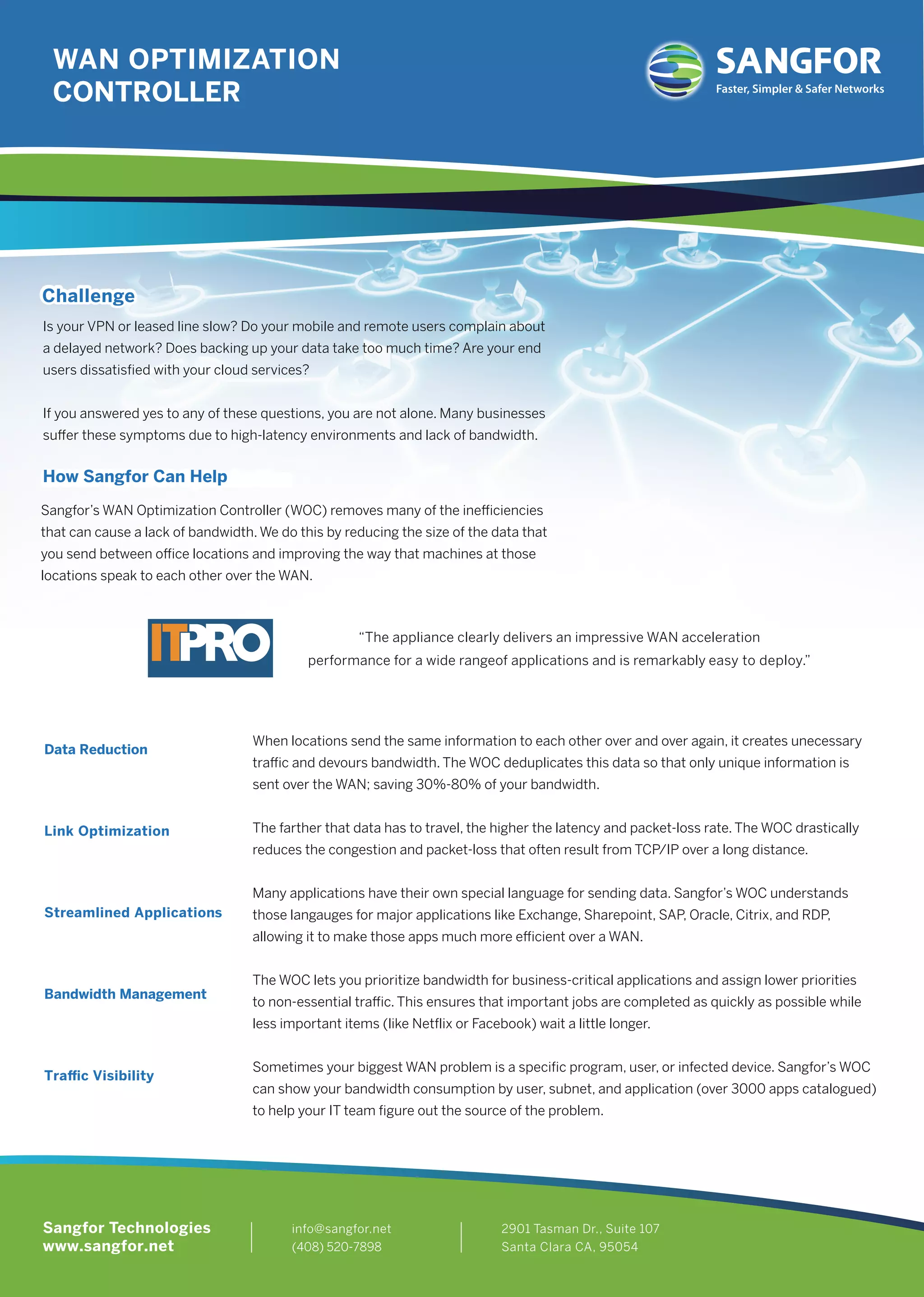 Sangfor's WAN Optimization Controller (WOC) addresses network inefficiencies in businesses by accelerating network traffic and reducing bandwidth usage through data deduplication. It enhances application performance, prioritizes critical business traffic, and allows visibility into bandwidth consumption by users and applications. Sangfor is a global leader in networking technology, helping over 28,000 businesses improve their network performance with tailored solutions.