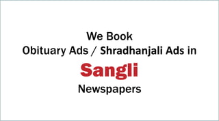 This document provides contact information for a company that books obituary and memorial ads in newspapers in Sangli, India. It lists their email and phone numbers and website for submitting ad content, and notes they have 11 years of experience in this service. It also mentions they can book various types of obituary and memorial ads but does not specify the types.