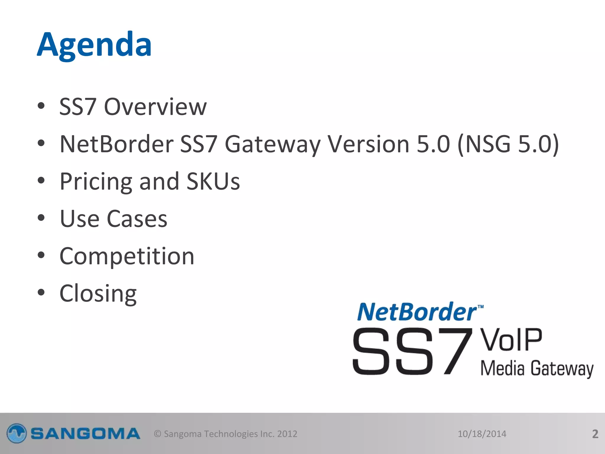 The document outlines the features and updates of Sangoma's NetBorder SS7 Gateway version 5.0, which is designed to facilitate interconnection between legacy PSTN networks and next-generation VoIP networks. Key updates include enhanced signaling protocols, flexible routing rules, and conformance testing support, making it suitable for both small and large service providers. The document also discusses competitive positioning against other technologies and highlights the cost-effectiveness of the NetBorder SS7 Gateway in emerging markets.