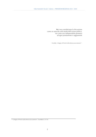 Il documento analizza le proiezioni della spesa sanitaria regionale in Italia tra il 2012 e il 2030, utilizzando un modello chiamato Sanimod-reg. Si evidenzia la necessità di efficientamento della spesa e di nuove modalità di finanziamento per garantire la coesione territoriale, con proposte per una redistribuzione equa delle risorse tra le regioni. Viene sottolineato che senza riforme e miglioramenti nell'efficienza, alcune regioni, in particolare nel sud Italia, rischiano di subire una pressione insostenibile sulla loro spesa sanitaria.