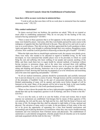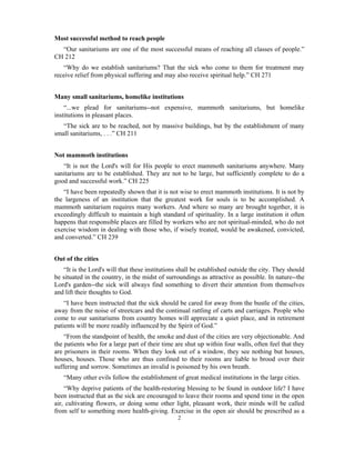 This document provides guidance on establishing sanitariums based on counsel given to Ellen White. It discusses that sanitariums should be established to educate people on healthful living through rational treatment and spiritual influences. Smaller sanitariums are preferable to large institutions, and should be located in rural areas with land for agriculture. They should be connected to training schools and serve both the poor and wealthy. All workers must practice health reform and the institutions should uplift spiritual principles. The success of sanitariums depends on acknowledging God and following His guidance.