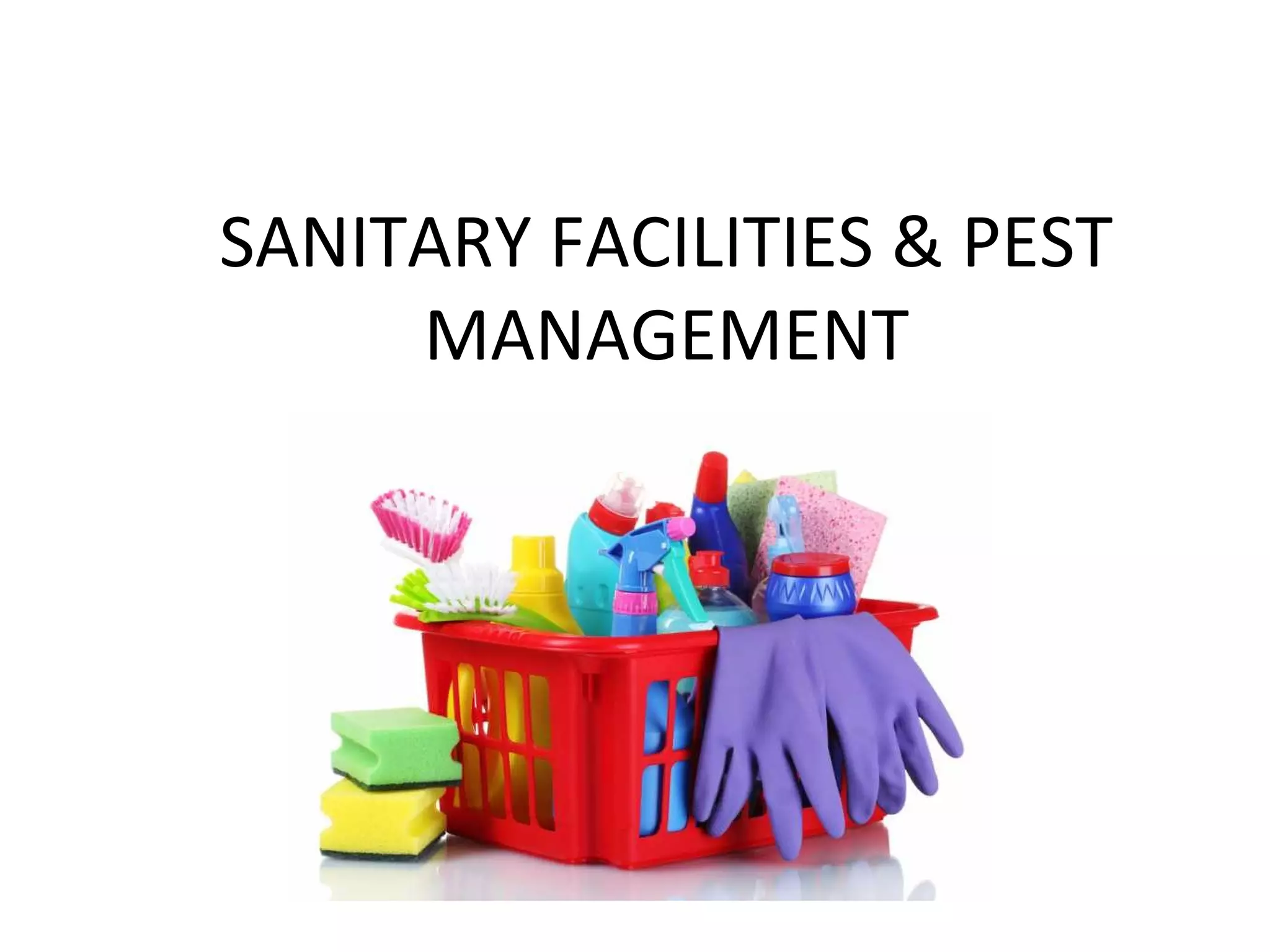 This document provides guidelines for maintaining sanitary facilities and pest management in food service operations. It discusses cleaning schedules and procedures for walls, floors, ceilings, ventilation systems, restrooms, and garbage areas. It also covers pest prevention, including sealing cracks and holes, and regular inspection and treatment by a licensed pest control operator. The document outlines methods for sanitizing small and large equipment using heat, chemicals like chlorine, iodine, and quaternary ammonium compounds.