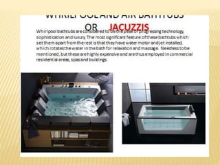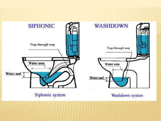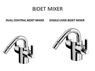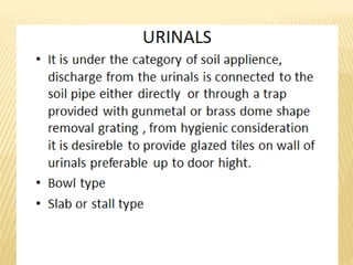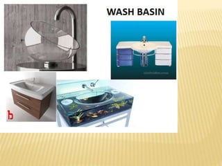 This document summarizes different types of sanitary fittings used in buildings. It discusses various types of wash basins including pedestal, wall hung, corner, and countertop basins. It also describes different types of sinks including apron, topmount, undermount, single and double bowl sinks. Various types of toilets are also outlined such as Indian, European, washdown, and symphonic toilets. Finally, the document briefly discusses other fittings like urinals, bidets, faucets, and bathtubs.