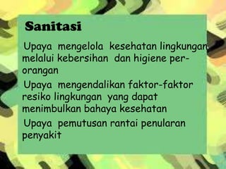 Dokumen ini menjelaskan pentingnya sanitasi air dan pengelolaan kesehatan lingkungan untuk mencegah pencemaran yang dapat menimbulkan bahaya kesehatan. Menyediakan data tentang sumber air minum di Indonesia dan syarat-syarat kualitas air yang sehat, termasuk aspek fisik, kimia, dan bakteriologis. Terdapat juga aturan terkait pengawasan air minum yang dilakukan oleh dinas kesehatan dan perlunya kolaborasi antara pemerintah dan masyarakat.