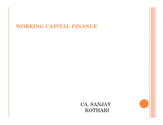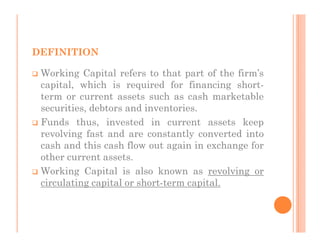 Working capital refers to the capital required to finance short-term operating needs such as inventory, accounts receivable, and cash. It is important for businesses to maintain adequate but not excessive working capital to support operations. Effective working capital management can improve cash flows and lower financing costs. Both too much and too little working capital can negatively impact a business's profitability and stock valuation.