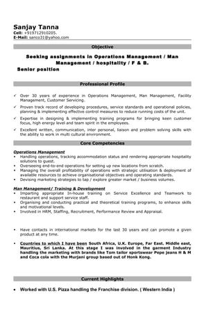 Sanjay Tanna is seeking senior level positions in operations management, facility management, or hospitality and food and beverage. He has over 30 years of experience in these fields. He has a proven track record of developing procedures and policies to reduce costs and increase customer focus and team spirit among employees. He also has expertise in training programs and managing overall operations profitability through strategic resource utilization. His skills include operations management, man management, training, and human resources functions like recruitment and performance reviews.