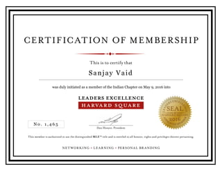 Sanjay Vaid joined the Indian Chapter of an organization on May 9, 2016. He was initiated as member number 1,465 of this group. The document provides brief details about Sanjay Vaid becoming a member of an organization in India.