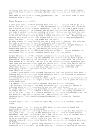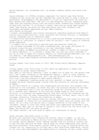 The document contains recommendations and reviews from multiple travelers praising Sanjib Adhikari for his services as a trekking guide in Nepal. They describe him as knowledgeable, responsible, helpful, and ensuring travelers have a rich, enjoyable experience. He is recommended for his nearly 10 years of experience, sense of humor, attention to customers' needs and pace, and ability to organize memorable trekking trips in Nepal.